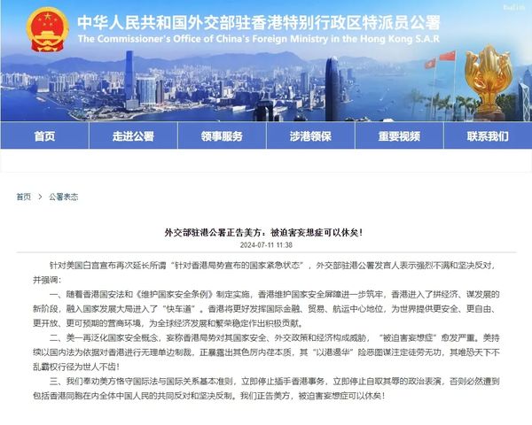 外交部驻港公署正告美方:被迫害妄想症可以休矣!7月11日,外交部驻港公署发表声明。……