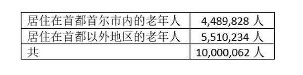 65岁以上的、正式在韩国国内合法居住的人口在7月11日时已达到10,000,062人,这是由韩国国内内政暨安全部方面获知的讯息。