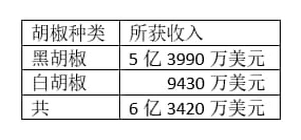 在这期间黑胡椒出口获得5亿3990万美元的收入,而白胡椒出口获得9430万美元。