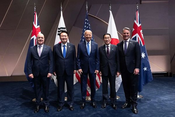 资料图:当地时间2024年7月11日,美国华盛顿特区,北约峰会期间,新西兰总理拉克森(左一)和韩国总统尹锡悦、美国总统拜登、日本首相岸田文雄、澳大利亚副总理兼国防部长理查德·马尔斯合影。(视觉中国)
