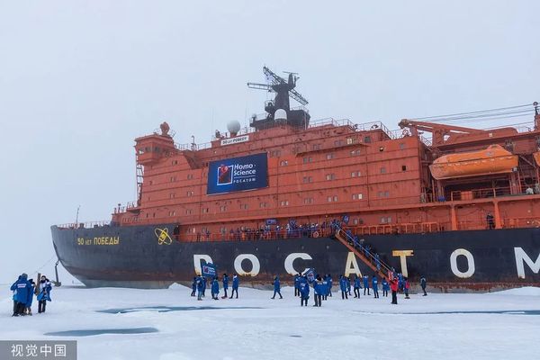 2021年8月18日,北极,俄罗斯160米的“胜利50年”核动力破冰船在北冰洋驶向北极。视觉中国