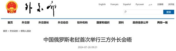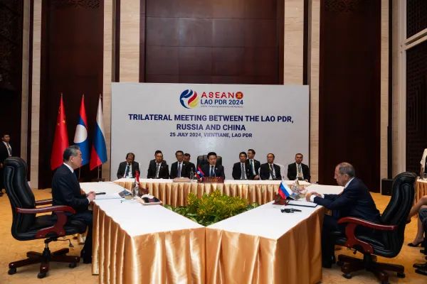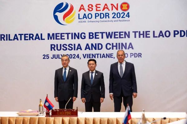 当地时间2024年7月25日,中国、俄罗斯、老挝在万象举行三方外长会晤。老挝副总理兼外长沙伦赛主持,中共中央政治局委员、外交部长王毅,俄罗斯外长拉夫罗夫共同出席。