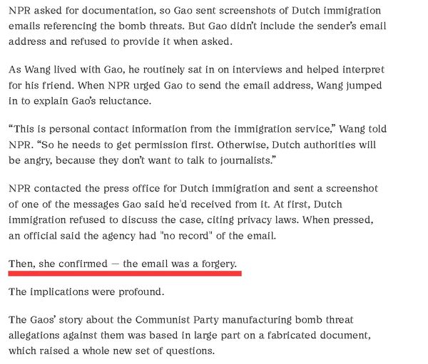 但美国国家公共广播的记者弗兰克,还是想让荷兰移民局给个说法,于是他又问了一次对方,而这额外的一问,却不得了了——因为荷兰移民局新给出的回应,直接把这个以为自己搞到了中国政府“陷害异见人士”这个大新闻的弗兰克,给整懵了。