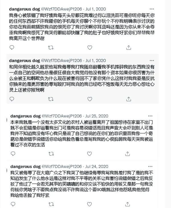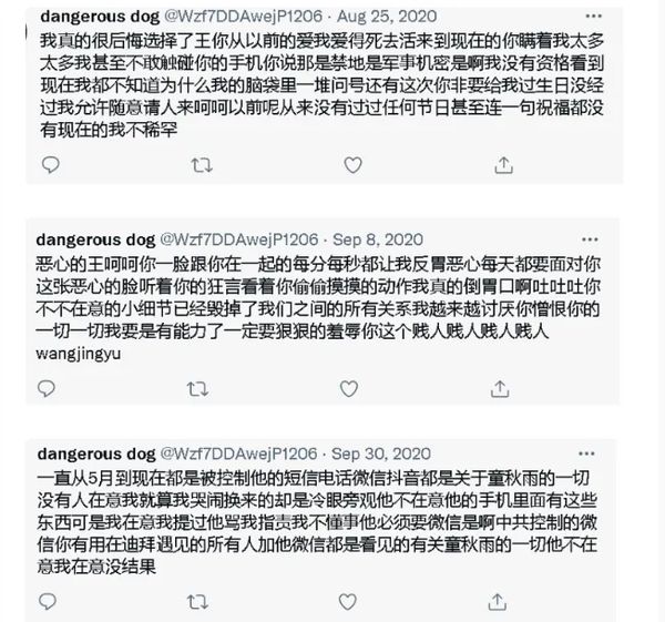 她还说王靖渝表里不一,比如“一边对别人说微信被中国政府控制不能用,一边自己却经常用微信与其他女生聊骚”。而且,从吴欢发帖的状态来看,她似乎已经被王靖渝搞的有些精神失常了,不仅跟着他一起骂中国,还咒骂过奥巴马和拜登。