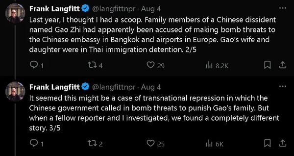 后来,在2023年的时候,美国国家公共电台的另一个名叫弗兰克(Frank Langfitt)的记者,从此时已经躲到了荷兰的王靖渝那里听说,他的室友、反华分子高某的家人,正在遭到中国政府在海外的“陷害”后,便立刻凑了上来,想要报道中国政府是怎么在其他国家“害人”的。