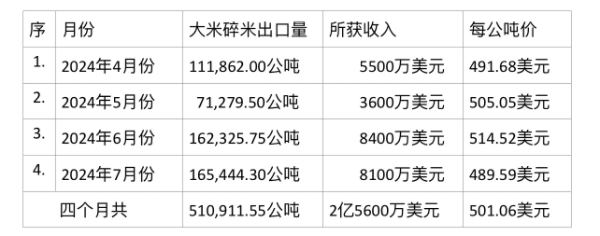 在2024—25财政年度这几个月内缅甸大米碎米出口情况如下:
