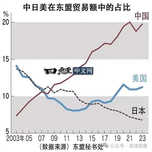 中国、日本、美国在东盟贸易额中的占比 日经中文网