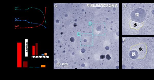 科研团队通过对不同月球矿物的进一步研究,还发现月壤钛铁矿加热后,可以同步生成大量单质铁和水蒸气气泡,是名副其实的月球“蓄水池”。