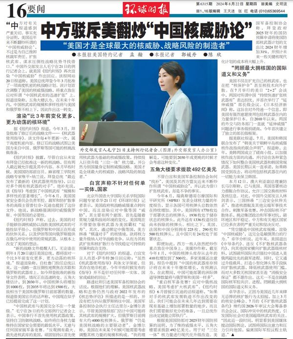 所以,美国的这种做法很快就引起了中方的关注和不满。中国外交部发言人毛宁在8月21日的记者会上就直言:事实充分证明,美国近年来不断翻炒所谓的‘中国核威胁论’,不过是为自己推卸核裁军责任、扩张核武库、谋求压倒性战略优势寻找借口。