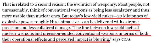 比如,“新美国安全中心”提到,随着核武器的不断升级,低当量的核武器已经可以做到,让美国当年投掷在日本广岛那样程度的原子弹杀伤力,“精确”地打击具体目标,同时还能“减少附加损失”。该智库甚至表示,低当量的战术核武器与精确制导的常规武器在作战效果等方面已经没啥区别了。