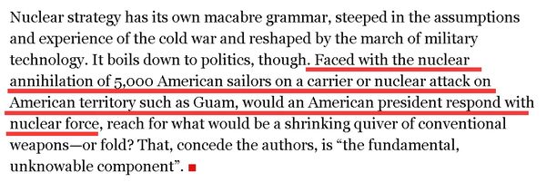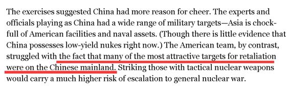 比起这些降低核武器门槛的表述,“新美国安全中心”在其战争推演中最让耿直哥感到不安的,其实是接下来的两句话。这两句话的大意是:1、当中国使用低当量的核武器摧毁美国在一个个小岛上的军事部署时,美国却难以对中国的那些有价值的目标进行反击,因为这些目标都在中国本土;2、当美军航母上的数千名士兵或是关岛等美国领土面临被核武器摧毁的可能时,美国总统是否会考虑用核武器还击呢?这本质上是一个政治问题。