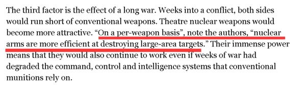 “新美国安全中心”还表示,在冗长的战争中,随着常规武器的耗尽,使用核武器不仅会变得“吸引人”,而且核武器也确实能更有效地摧毁一大片区域里的目标——更何况,作战部队的指挥、控制和情报系统的效力,往往会随着战争的拖延而打折,但威力强大的核武器却不像常规武器那样需要依靠这些系统的支持。