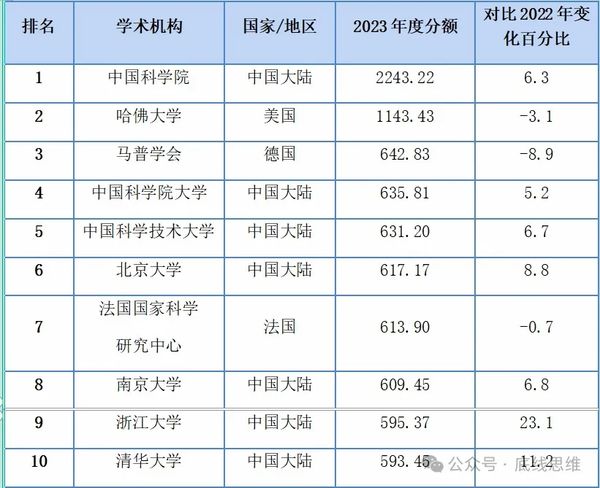 按照这个方法统计,中国大陆及港澳(自然指数在统计计算中将台湾省单列)在2023年度发表的145本杂志中(2024年版的指数),取得的份额数量超过美国,首次排名世界第一(见表1),比2022年增长了13.6%。