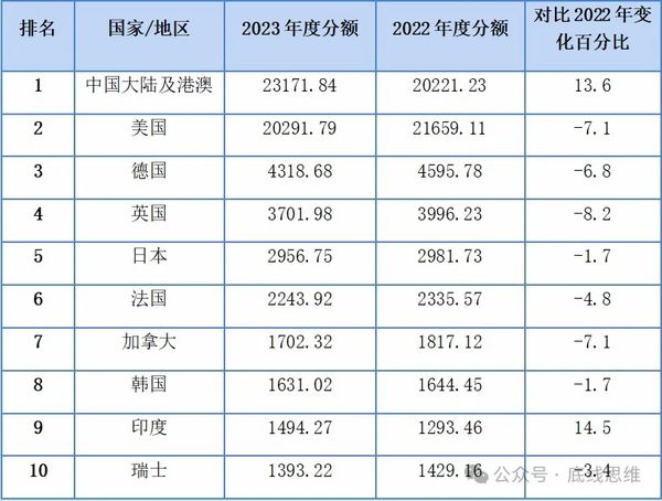 排名第三的是德国,但所占份额与美国一样均有下降。排名前十的国家或地区,另外一个份额上升的国家或地区是印度,排名高于总人口不足九百万的瑞士。