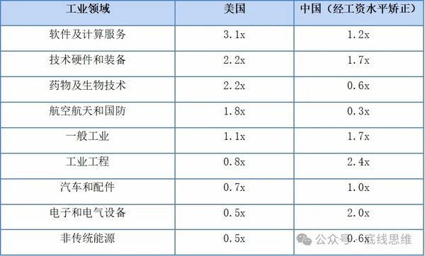 这里我援引美国非盈利性公共政策智库信息技术与创新基金会(Information Technology and Innovation Foundation)于2023年7月公布的报告《创新之战:中国如何在企业研发上取得对美优势》(“Innovation Wars: How China Is Gaining on the United States in Corporate R&D”)。该报告考虑了企业规模大小的差异以及中国企业劳动者相对低的工资收入水平,采用了根据欧盟统计的全球2500强企业研发投入数据,依照规模大小和工资水平矫正的归一化后的行业集中度参数,对比中国和美国在九个不同工业领域的企业研发投入,得到表5(原报告表2):