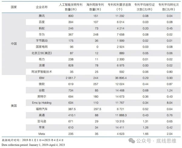 从表6可以看出,中国对比美国头部企业在人工智能国际发明专利方面,除去断崖式领先的IBM,单纯从数量上来说并无明显劣势,但在专利要求总数上,尤其是专利平均被引证次数以及专利转化次数上存在劣势。该研究还对比了两国头部企业学术论文发表的相关情况(总体而言,在国际学术论文发表上,中国相对美国的头部企业也处于劣势),并分析了企业合作高校或科研机构的对比情况。考虑到对于企业技术研发而言,专利技术优先次序高于学术论文,这里就不一一贴出,感兴趣的可以自行点击给出的链接查阅(文章为开放获取)。