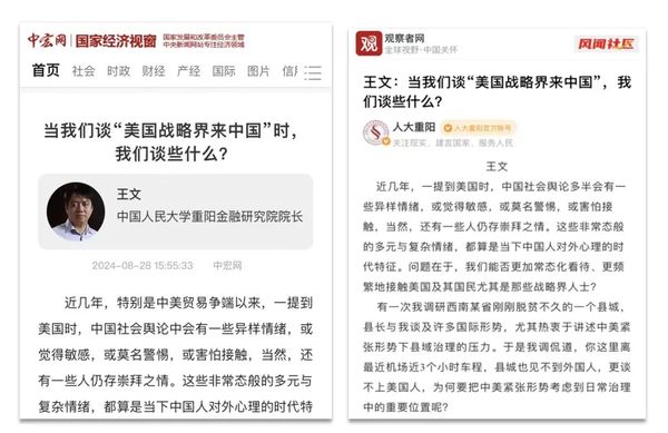 8月28日,中国人民大学重阳金融研究院院长王文在国家发改委中宏网、观察者网发表文章《当我们谈“美国战略界来中国”,我们谈些什么?》指出,在中美交流的过程中,我们应该谈如何更好地接触对方、更好地阐述中国、更轻松地与之交往,而不是“安全泛化”似的担心、害怕、警惕、防范。至少在当前这个特殊时代,拥有这份自信、开放的心态非常重要。现发布如下: