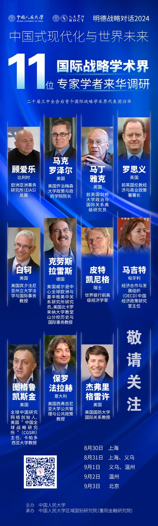 编者按:2024年8月底,中国人民大学将主办“‘中国式现代化与世界未来’明德战略对话(2024)——国际战略学术界走进中国(以下简称:明德战略对话)”活动。11位来自美国、欧洲的战略学术界代表将来到中国多日,先后深入探访上海、义乌、温州、北京等城市及乡村,与中国政府、企业、战略学术界代表深度对话。