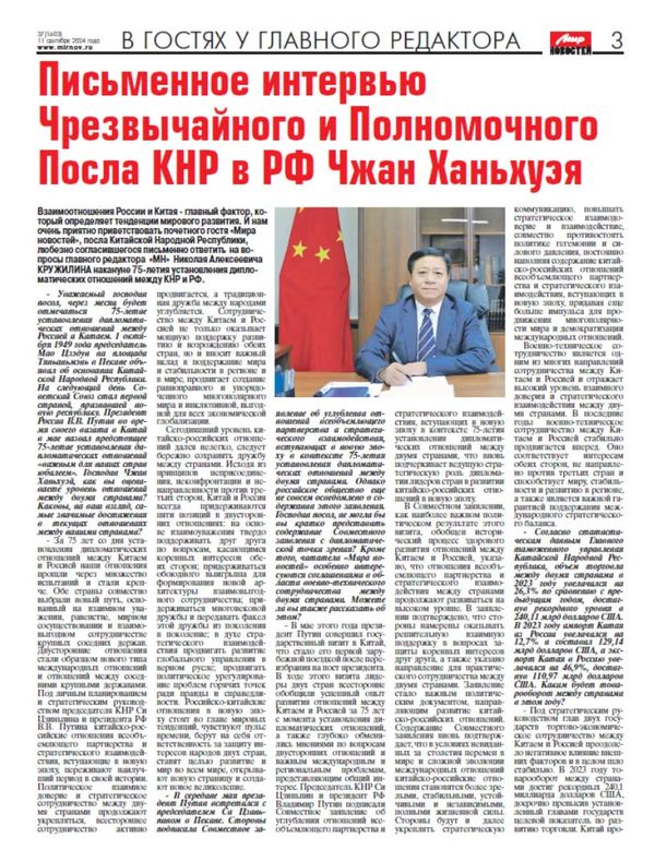 据中国驻俄罗斯大使网站消息,9月11日,张汉晖大使就中俄高层交往、经贸合作、人文交流等问题接受俄罗斯新闻周刊《新闻世界》书面采访。采访内容同时在《新闻世界》当天报纸和网站发布。采访全文如下: