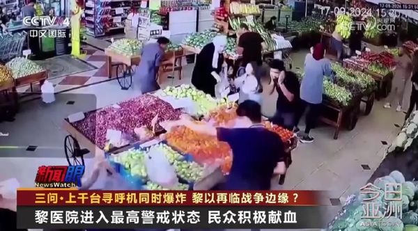 监控画面:当地时间17日下午三点半左右,在贝鲁特南部一家超市的水果蔬菜区,一只寻呼机突然爆炸。从三点半到四点半,上千台寻呼机在黎巴嫩多个地点被引爆。