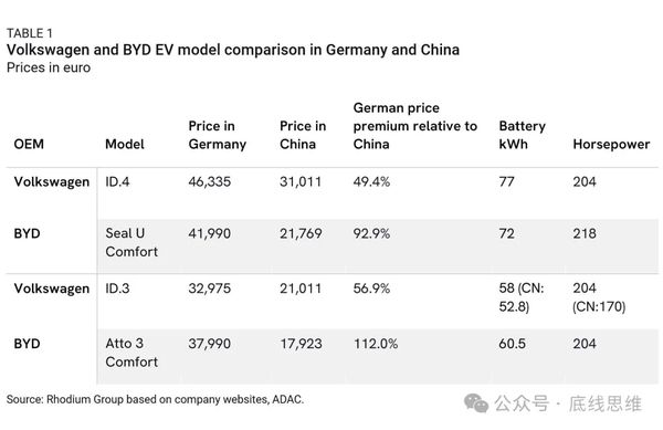 大众和比亚迪电动汽车价格对比。图源:荣鼎