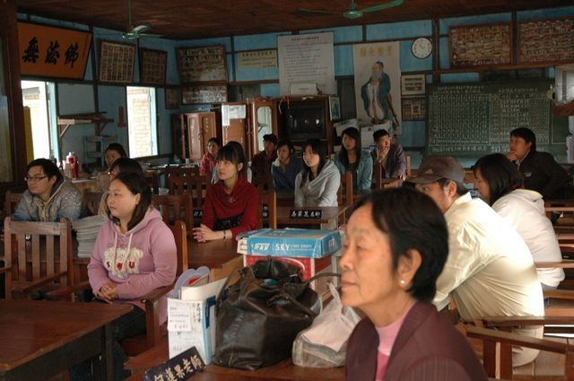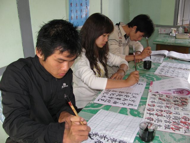 明德文教会于1976年开办,至今也有35年,目前学生2000多人,其中不少是缅甸大学的学生。璧报上张贴着学生们的书法练习页,有三个同学即刻现场展示书法,虽说火候未到,却是书写自如、一撇一捺、中规中矩,如不是亲眼目睹,怎么也想不到这么小的年纪竟能写出一手好字来。毛笔书法也是我国国粹之一。用毛笔书写,自有一番艺术,为钢笔、园珠笔书写文字所不能够呈现。