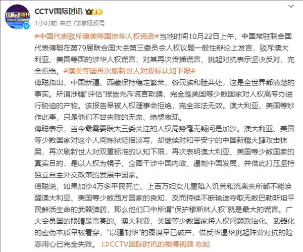 当地时间10月22日上午,中国常驻联合国代表傅聪在第79届联合国大会第三委员会人权议题一般性辩论上发言,驳斥澳大利亚、美国等国的涉华人权谎言,对其再次传播谎言、挑起对抗表示坚决反对、完全拒绝。
