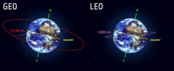 地球同步轨道(GEO)与近地球轨道(LEO)示意图。NASA官网