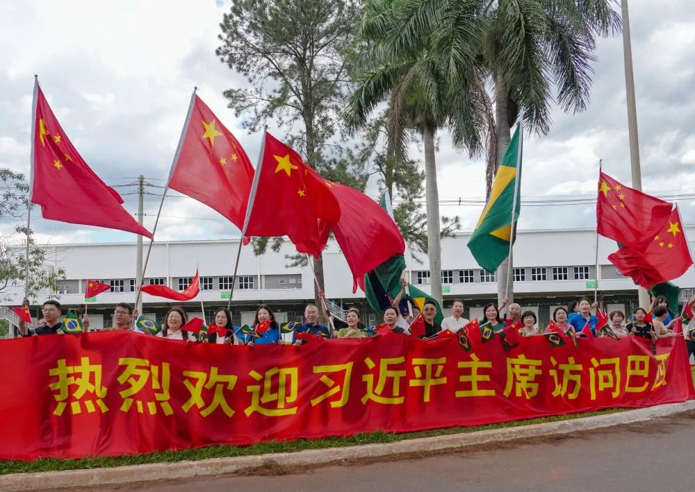 习近平乘车从机场赴下榻饭店途中,当地华侨华人、中资机构和留学生代表在道路旁挥舞中巴两国国旗,高举“欢迎习近平主席访问巴西”“中巴友谊万岁!”等红色横幅,热烈欢迎习近平到访。