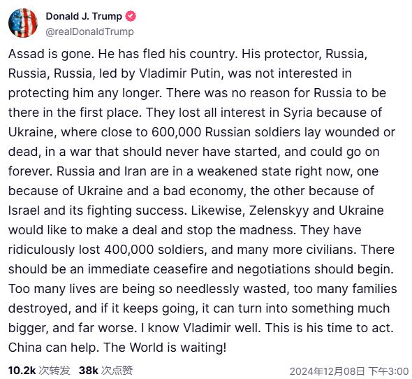 “阿萨德已经下台了。他逃离了自己的国家。他的保护者,由普京领导的俄罗斯,已经不再有兴趣保护他了。”特朗普表示,“俄罗斯当初就没理由出现在那里。由于乌克兰问题,俄罗斯对叙利亚完全失去了兴趣,在这场本不该爆发且可能会没完没了的战争中,有将近60万俄罗斯士兵受伤或阵亡。”