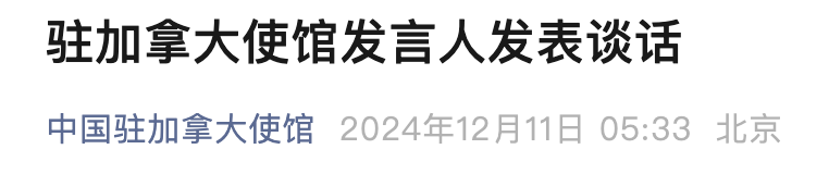 12月10日,加拿大外交部打着所谓人权的幌子对中国进行栽赃抹黑,宣布对中方有关人员实施非法制裁,有关行径严重违反国际法和国际关系基本准则,严重干涉中国内政,性质十分恶劣,中方对此坚决反对,予以强烈谴责。