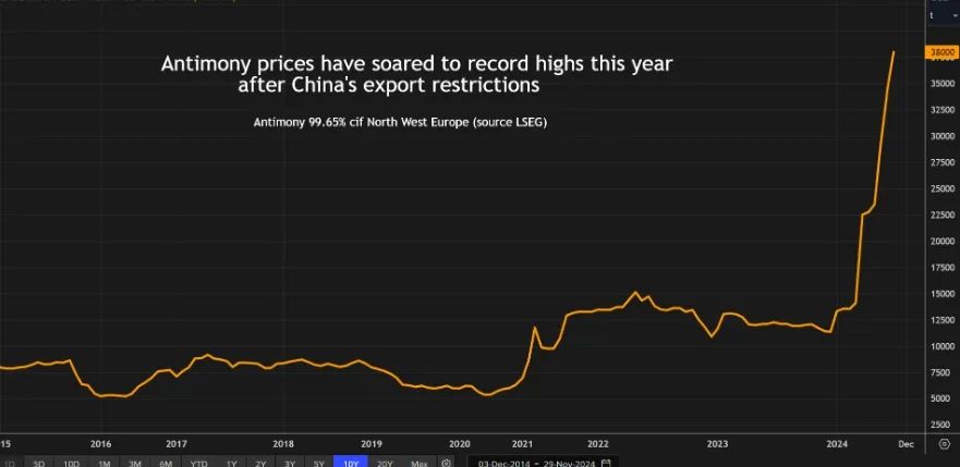 在中国宣布新的出口限制后,全球锑的价格从年初的每吨1.3万美元飙升至3.8万美元。同期锗的价格从 1650美元飙升至2862美元。