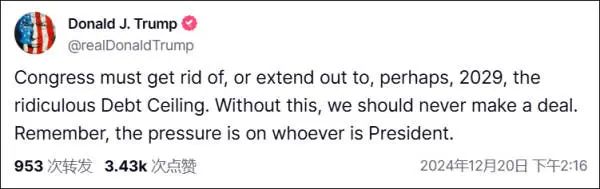 特朗普则在社交媒体平台发文表态称:“国会必须废除荒谬的债务上限,或者延长到2029年。做不到这一点,我们就不应该达成协议。”