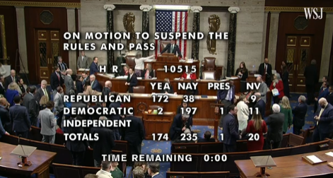 但当晚,众议院仍以235票反对、174票赞成,赞成票未达三分之二多数票的结果,否决了这项法案。此时距临时拨款法案到期仅剩不到24小时,美国政府关门已迫在眉睫。