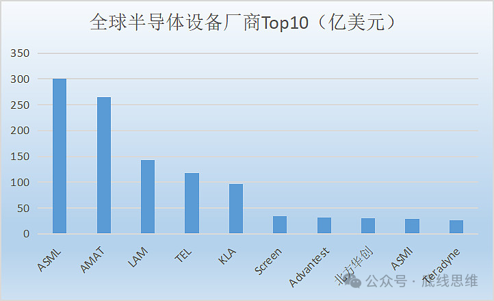 最后介绍下全球芯片设备企业。2023年,中国首次有芯片设备企业历史性地进入全球前十,北方华创营收220.79亿人民币(约30亿美元),排第八位。荷兰的ASML以约300亿美元营收排第一,美国应用材料、泛林、科磊三家制裁依靠的核心企业分别排第二、第三、第五,日本东京电子第四。前五营收明显高于其他企业。日本的迪恩士、爱德万分列第六、第七,荷兰ASMI第九,美国泰瑞达第十。要进入前十,年营收门槛为26亿美元。