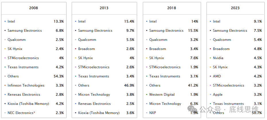 从2008-2013-2018-2023的前十变动来看,英特尔、三星、高通、博通、SK海力士、意法半导体、德州仪器比较老牌,稳定上榜。其中高通和博通是Fabless纯设计企业,需要代工,其它是IDM模式企业(包括存储器生产商),自有芯片制造工厂。到2023年,英伟达、AMD、苹果的芯片业务崛起了。进过前十又掉出去的IDM模式企业,还有西部数据、NEC电子、英飞凌、瑞萨电子、美光、铠侠。英特尔2008年营收为376亿美元,2013年为527亿美元,2018年为708亿美元,2023年为542亿美元,可据此估算各企业的营收数值。