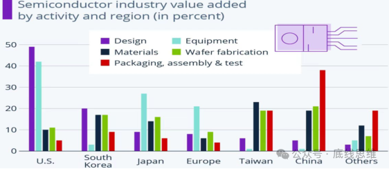 根据美国半导体产业协会(SIA)收集的数据,2022年末全球芯片设计(Design)、芯片设备(Equipment)、晶圆加工(Wafer fabrication)、封测(Packaging, assembly & test)、硅片及耗材(Materials)份额如上图。芯片设计与设备按企业总部所属国家算。晶圆加工和封测,产品是从工厂里出来的,按工厂所在地区算份额。