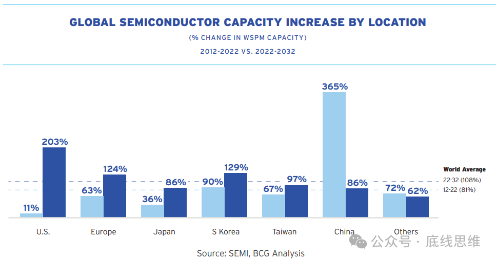 从上图预计来看,欧洲、日本、韩国、中国台湾2022-2032年间都有不低的扩产计划,力度超过2012-2022年,因为都认识到了芯片业的战略意义。而中国大陆先进芯片制造设备供应被卡,扩产将受到限制,因此产能增速在主要玩家中可能会是最低的。当然这是报告预计,实际结果上来说,西方国家经常完不成计划,而中国往往超出预期。