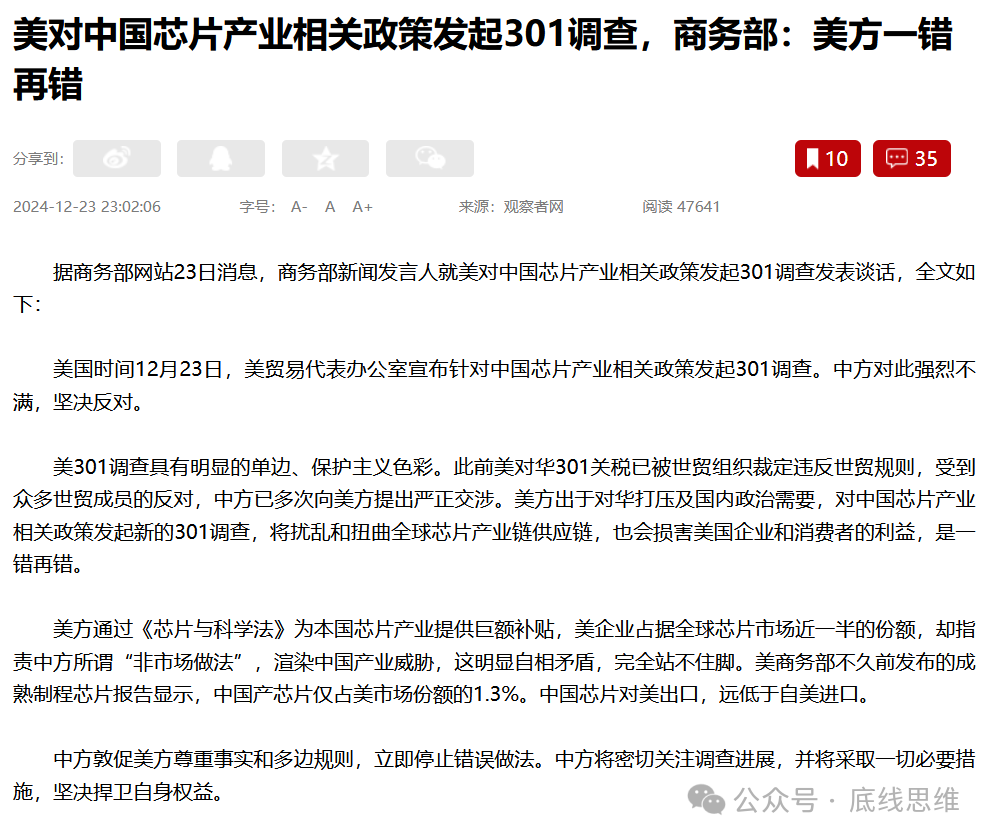 了解了全球与中国芯片产业格局的基础知识后,再来看美国对中国成熟芯片发起301调查的新闻,来龙去脉就清楚多了。