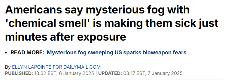 据英国《每日邮报》6日报道,自2024年12月以来,美国多地出现“神秘大雾”,不少人自称接触后不久就发烧咳嗽。这也引发了美国社交媒体上的阴谋论,一些恐慌的民众怀疑,这场大雾并非是单纯的空气问题,而是美军在对民众秘密进行“生物战实验”。