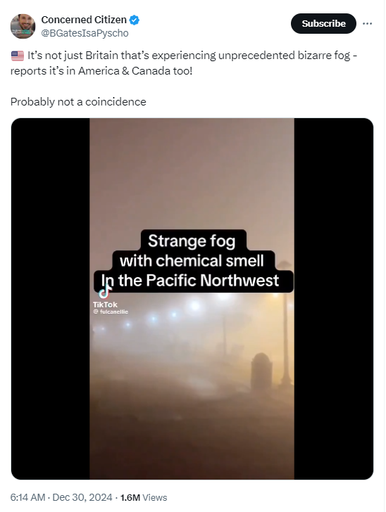 报道援引这些网民的消息称,自2024年12月下旬开始,美国得州等12个州都有大量居民表示,自己在户外看到了这种 “神秘大雾”。许多目击者在社交媒体上发布了相关视频,还有不少人表示,自己接触这些“神秘大雾”仅10分钟左右,就出现了咳嗽、眼睛充血和肠道不适等症状。