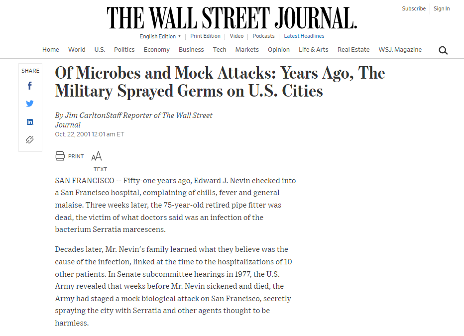 美国中央情报局2012年解密的档案显示,美国海军曾于1950年开展了一次秘密生物武器实验,在长达一周的时间里,美国海军在旧金山海岸附近抛洒粘质沙雷氏菌等病原体,利用旧金山市的43个监测点对有害物质的扩散情况进行监测。