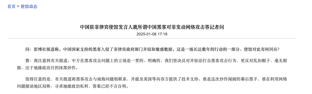 问:彭博社报道称,中国国家支持的黑客入侵了菲律宾政府部门并窃取敏感数据,这是一场长达数年的行动的一部分。使馆对此有何回应?