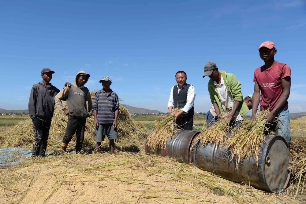 在马达加斯加首都塔那那利佛附近的马义奇镇,中国杂交水稻技术专家胡月舫(右三)在中国国家杂交水稻工程技术研究中心非洲分中心的试验田里和当地农民一起收获水稻。图源:新华社