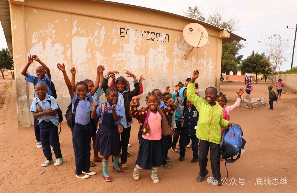 2023年7月25日,莫桑比克马普托省皮科科村学校的孩子们站在装有中国援助的卫星电视接收天线的房屋前。“万村通”项目旨在为非洲国家的1万个村庄接入卫星数字电视信号,项目2018年在莫桑比克启动,为该国1000个村落、2万户家庭和3000个公共场所安装卫星电视设备,提供电视信号和节目,覆盖农村人口达250万。图源:新华社