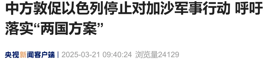 中方表示,新一轮巴以冲突使加沙面目全非,许多人遭受了难以想象的痛苦。中方衷心希望所有痛苦都可以结束,希望所有被扣押人员尽快获释,希望加沙恢复和平,但局势发展事与愿违。以色列在加沙重新挑起战火,使停火协议崩溃,制造更多的痛苦和死亡,中方对此表示严重关切。事实已经证明,实现持久停火是拯救生命、让被扣押人员回家的最好方式。中方敦促以色列放弃使用武力的执念,停止对加沙的军事行动。希望停火协议的保障国秉持公正、负责任态度,采取行动推动停火协议三阶段连贯落实,在加沙实现持久停火。