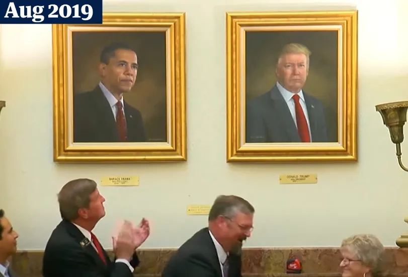这幅自2019年就挂在科罗拉多州议会大厦内的肖像画,近日遭特朗普抱怨“故意失真”  视频截图