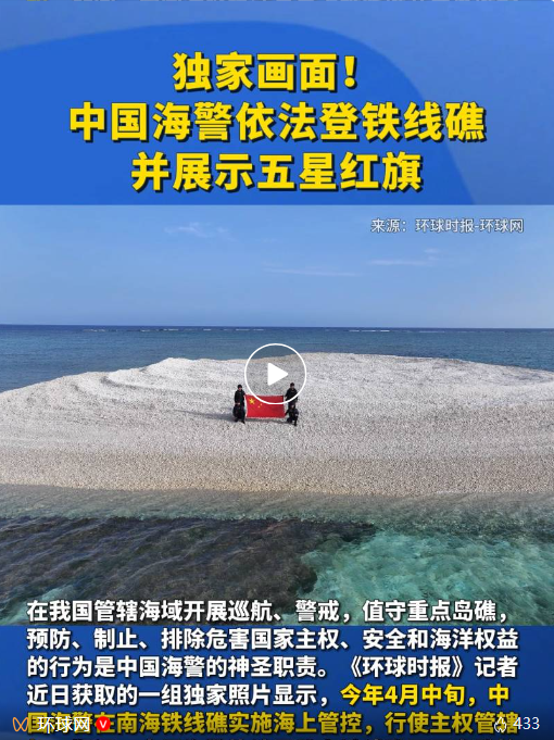 文章导读 中国海警登临铁线礁开展维权行动制作:环视频/王力在我国管辖海域开展巡航、警戒,值守重点岛礁,预防、制止、排除危害国家主权、安全和海洋权益的行为是中国海警的神圣职责。《环球时报》记者近日获取的一组独家照片显示,今年4月中旬,中国海警在南海铁线礁实施海上管控,行使主权管辖权……