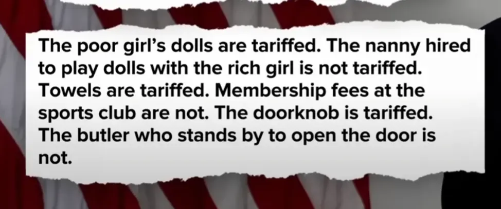 他还以一个低收入家庭在家吃的一顿饭为例,指出关税会直接影响到这个家庭吃饭用的桌子、椅子、盘子、刀叉乃至意大利面的价格。但对于一个在餐厅吃饭的富裕家庭而言,他们只需要支付饭钱,而这顿饭菜的主要成本则来自厨师和服务员的工资、餐厅的房租以及其他运营开支,但这些成本却都不需要缴税。