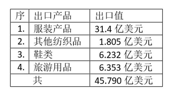 另外鞋类产品出口6亿232万美元,旅游用品也向国际市场出口了6亿353万美元。这是由有关报告书中获知的讯息。